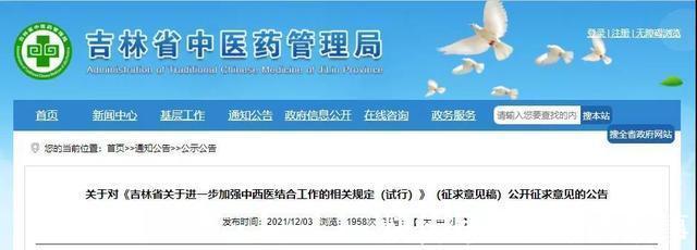 2021年12月3日吉林省中医药管理局发布“关于对《吉林省关于进一步加强中西医结合工作的相关规定(试行)》(征求意见稿)公开征求意见的公告”通知,小编为大家整理如下六点重点内容: